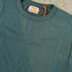 Velva Sheen very green rolled t-shirt. 100% cotton slub tee with a a soft, vintage feel, recreated from the late 70’s original. Tube tee with no side seams, made on a circular loom. Runs small but is casual fitting in the body. We recommend sizing up one size.